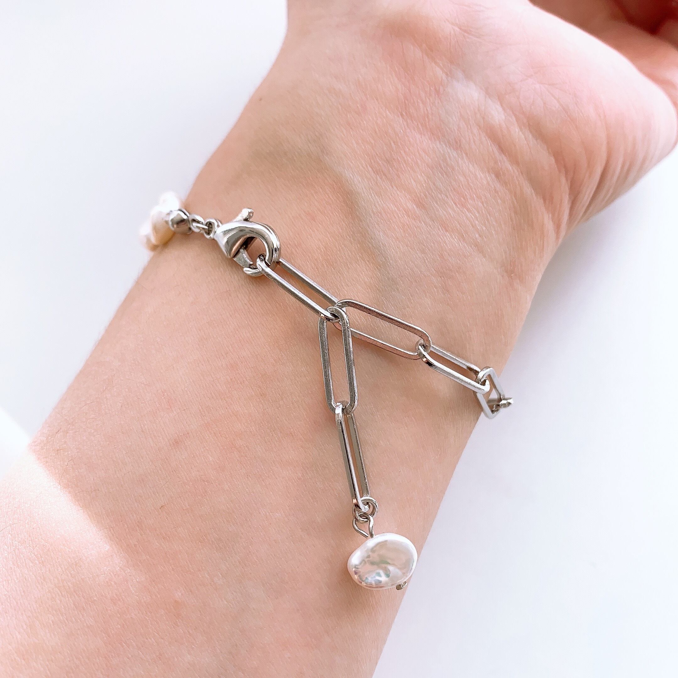 ブラック淡水パールのチェーンブレスレットご好評いただいておりますが、こちらは定番の白です。