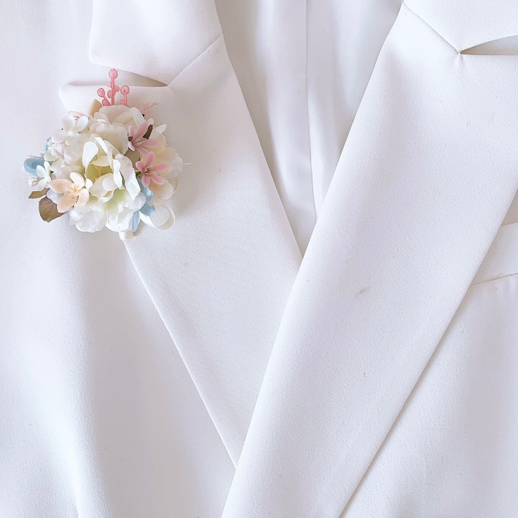 直径7cmの小さめコサージュで小慣れ感を出して。